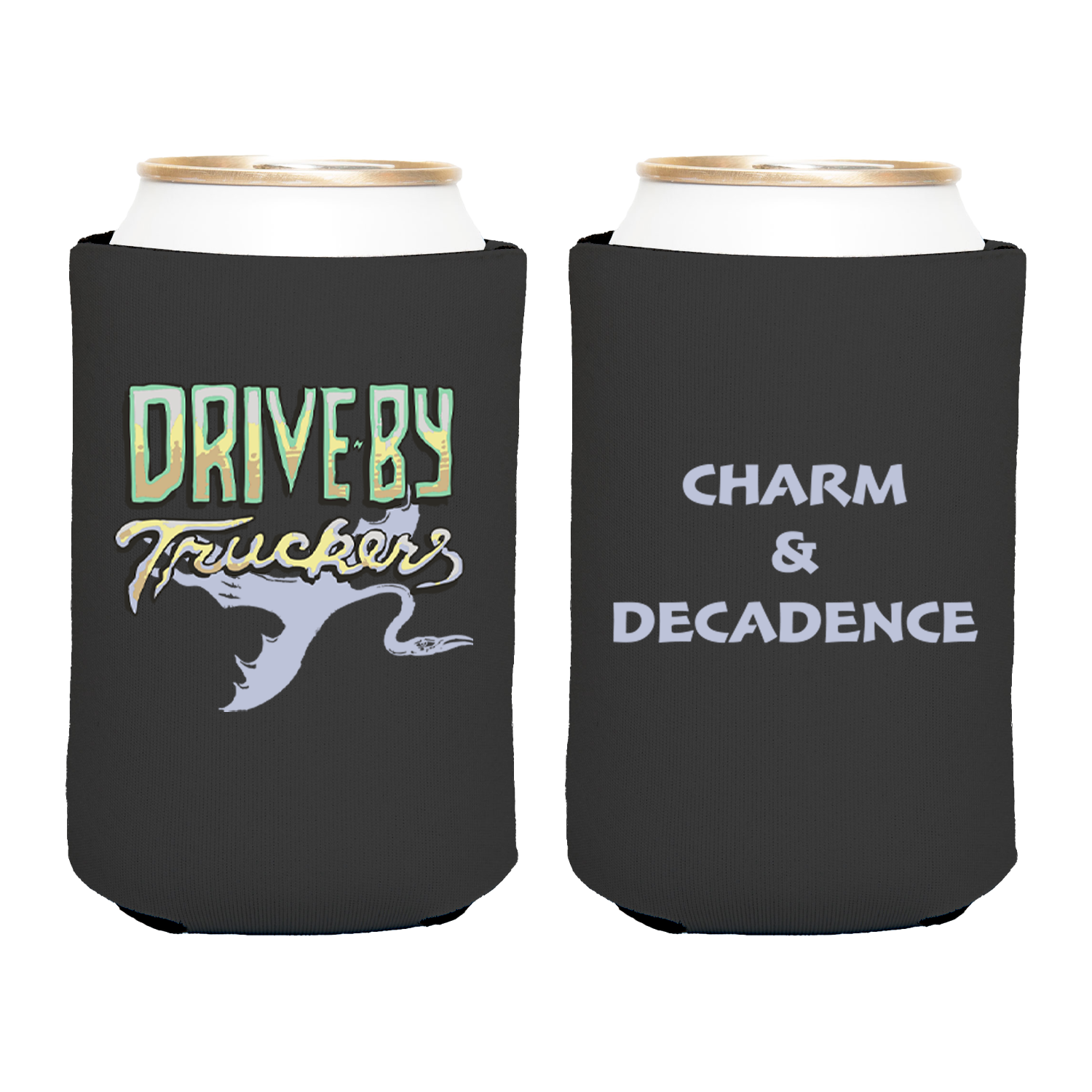 Charm & Decadence art by Wes Freed on a black neoprene can koozie.
